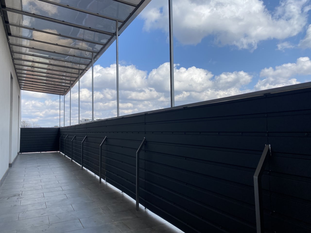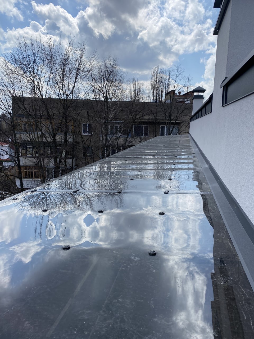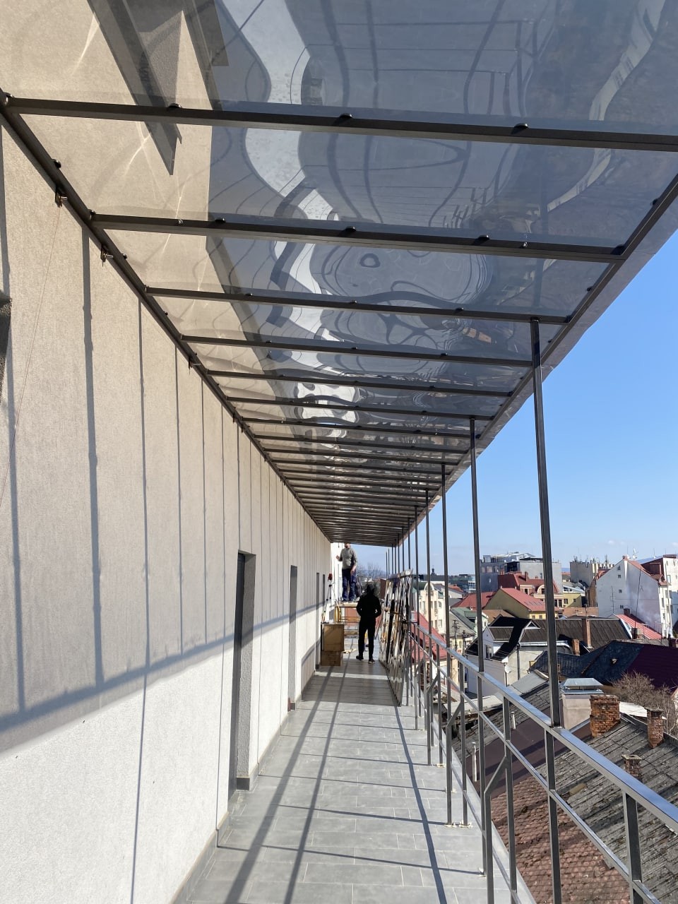Козирек або навіс виготовлений в основі рами з металу , пофарованої в темно сірий колір , на опорах до перил . Верх навіса зашитий монолітним полікарбонатом в темно сірому відтінку, який не бьється градом, має дуже хороші експлутаційні властивості і виглядає як скло. Ця вся конструкція виготовлена нашою компанією і професійно встановлена з врахуванням всіх ньюансів, наприклад полікарбонат має властивості розширюватись під час перепаду температур, і тому треба правильно його втсановити щоб потім не було проблем.