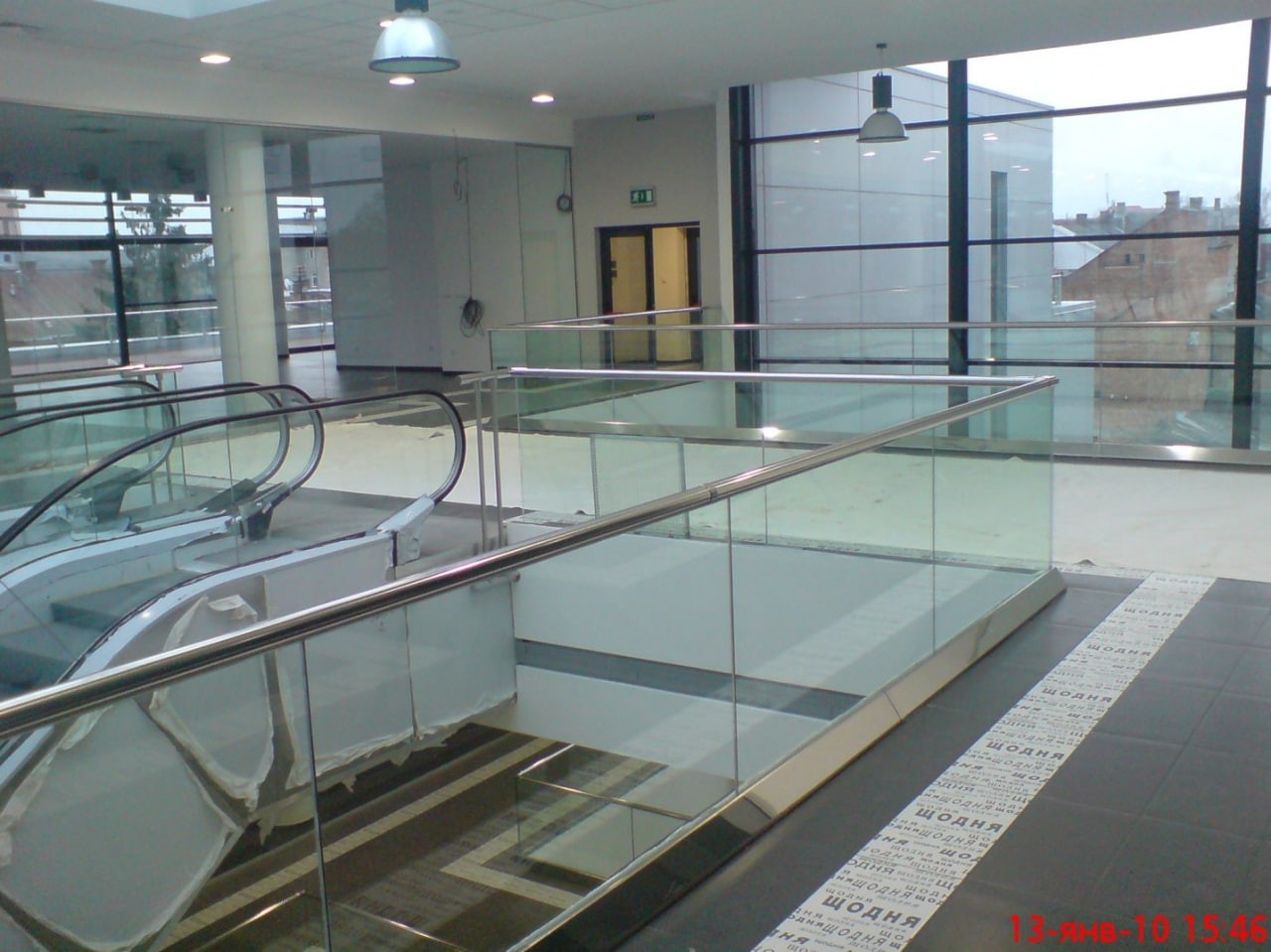 Огородження тераси, внутрішніх атріумів та сходових кліток перилами. Індивідуальних проект, кріплення перил тераси - індивідуально виготовлялися згідно проекту замовника. Скло тріплексоване . Перила на сходових клітках - з нержавіючої сталі, з вертикальним заполвненням для безпеки. Проект був повністью виготовлений і встановлений нашою компанією "Tandem".