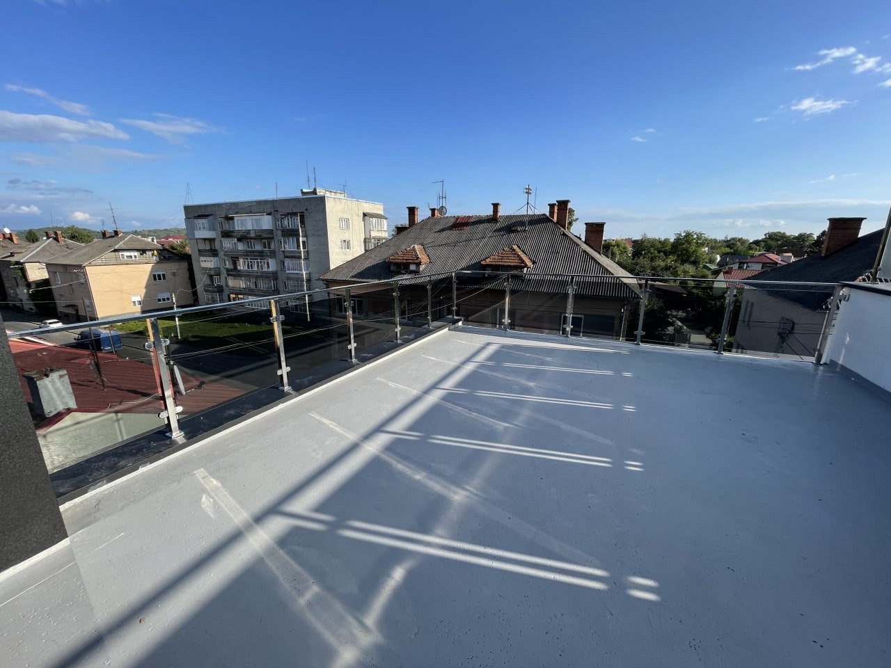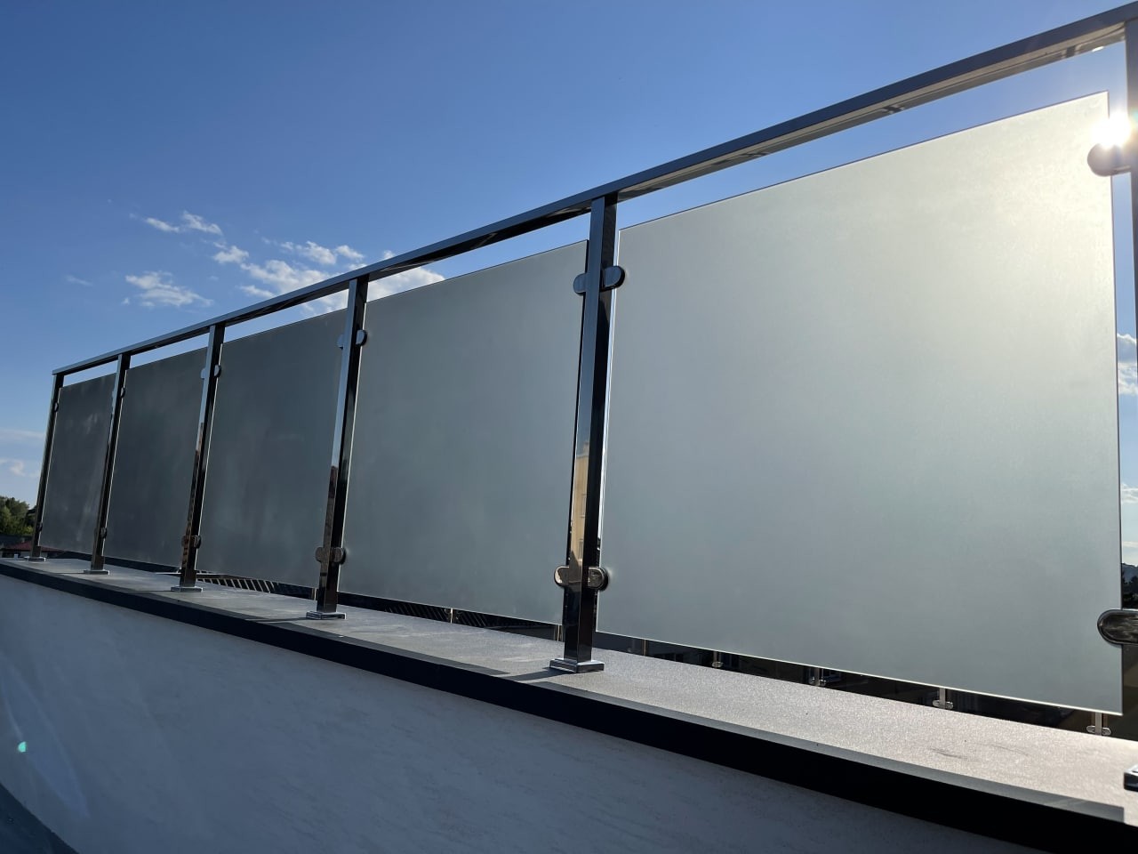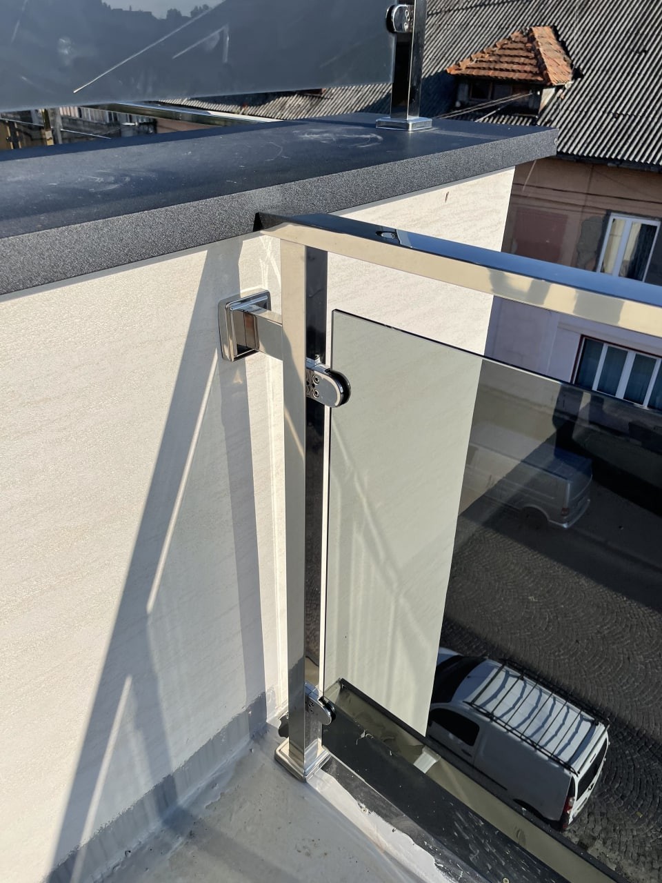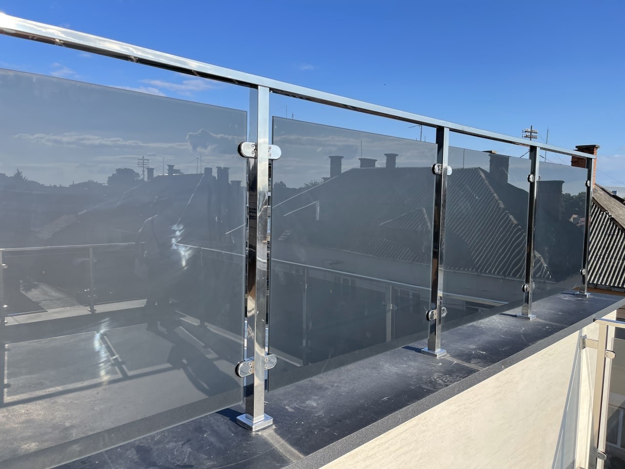 Перила з квадратних нержавіючих труб, в зеркальній поліровці, заповнені сірим тонованим склом. Виглядає дуже сучасно , на нових котеджних будинках . Практичне, гарне та сучасне рішення для огородження балконів.