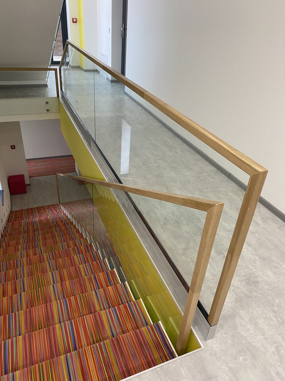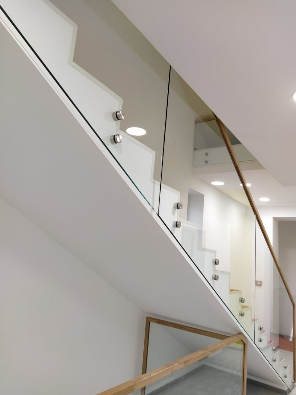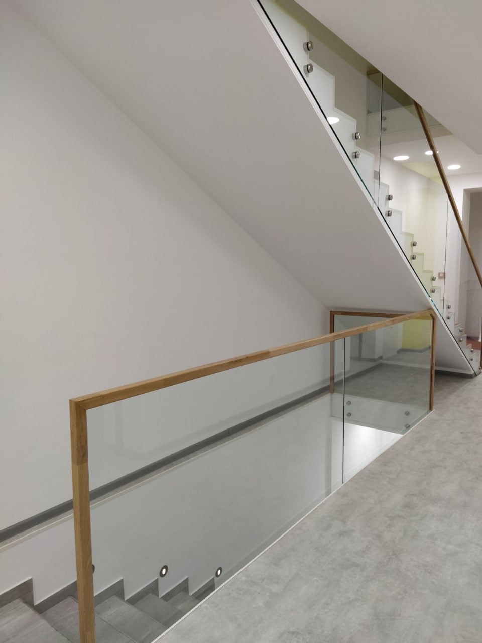 Перила виготовлені і встановлені з безпечного тріплексованого прозорого скла, закрите дубовим лакованим поручнем. Скло встановлене на бокове точкове кріплення і місцями в шину профіль на підлогу. Проект виконаний нашою компанією згідно проекту дизайнера.