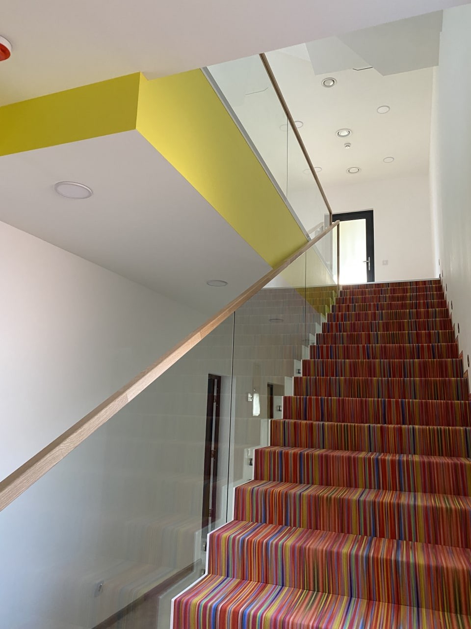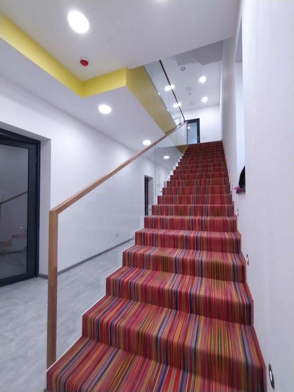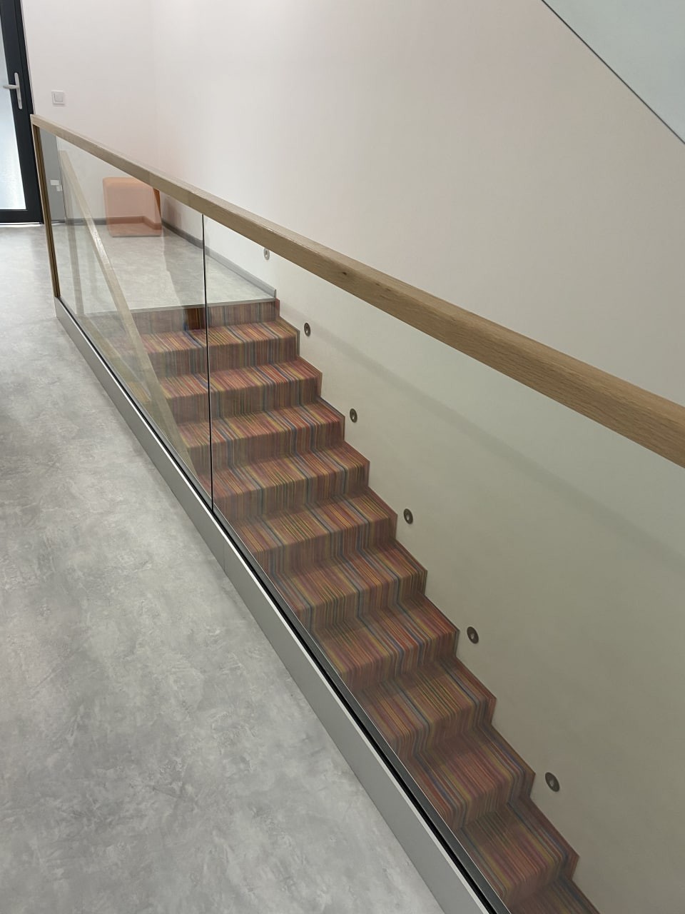 Перила виготовлені і встановлені з безпечного тріплексованого прозорого скла, закрите дубовим лакованим поручнем. Скло встановлене на бокове точкове кріплення і місцями в шину профіль на підлогу. Проект виконаний нашою компанією згідно проекту дизайнера.