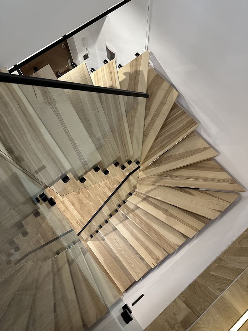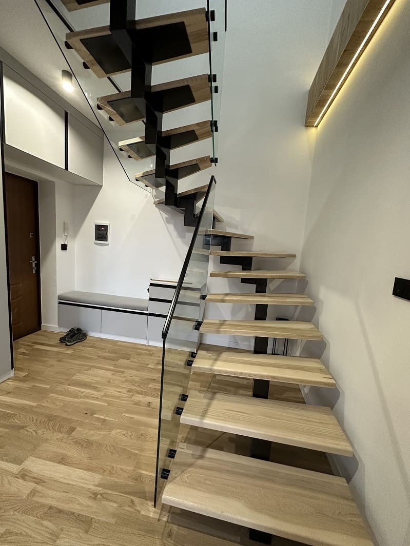 Спроектували, виготовили і встановили каркасні сходи. Каркас центральний із профіля 100*100 мм. Фарбований в чорний колір. Перила на сходи: прозоре скло, кріплення бокове на точки + поручень на скло. Фурнітура в порошковій фарбі, колір чорний мат.