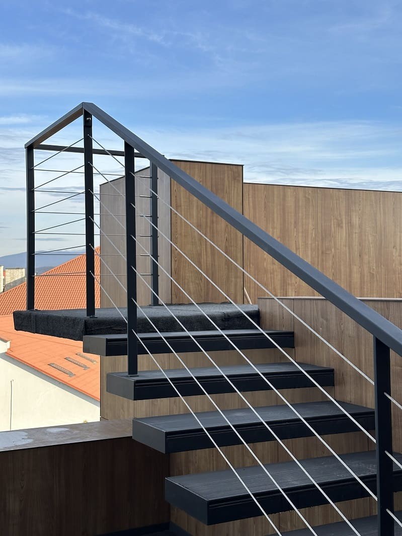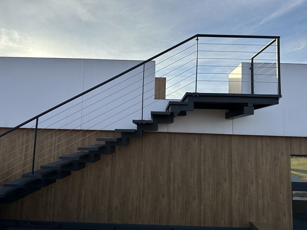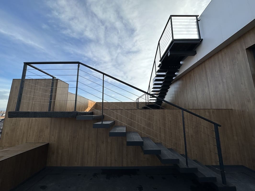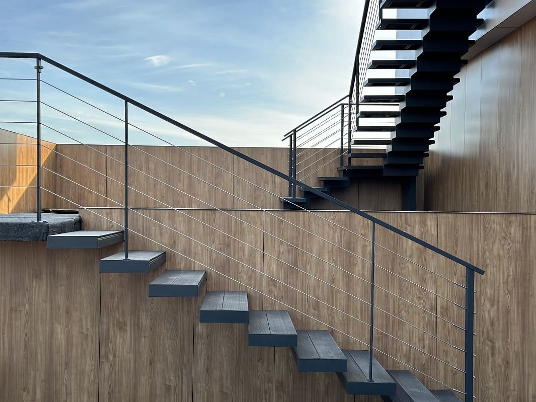 Нашою командою було спроектовано такий проект двух сходів. Виготовлено і змонтовано. Перші сходи називаються консольні сходи, безкаркасні. Сходинки із металу прикріплені до стіни без каркасу під ними, і все грамотно обшито. Тому кріплення не видно , і ступеньки як у повітрі. Другі сходи на монокаркасі, індивідуальний проект. Каркас виготовлений шириниою 500 мм, товщиною 100 мм. Все пофарбовано в порошкову фарбу. Самі сходинки зверху на обоїх сходах обшиті террасною дошкою. Яка супер виглядає і практична і не сковзька. Перила виконані з металу, в порошковій фарбі. Всі зєднання механічні. Заповнення перил - тросики із нержавіючої сталі.