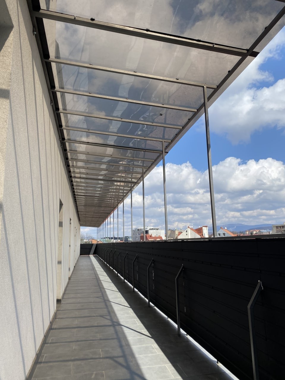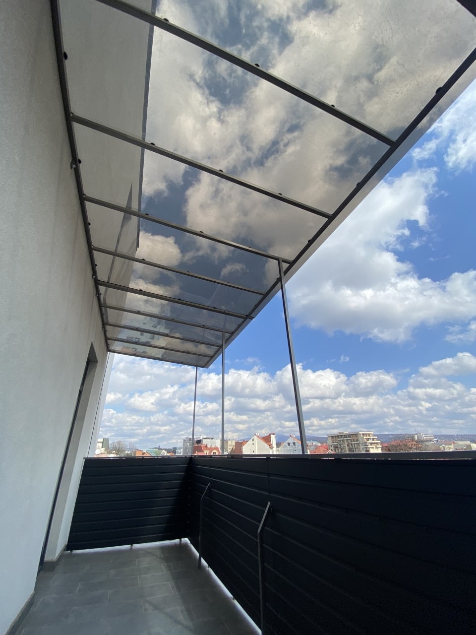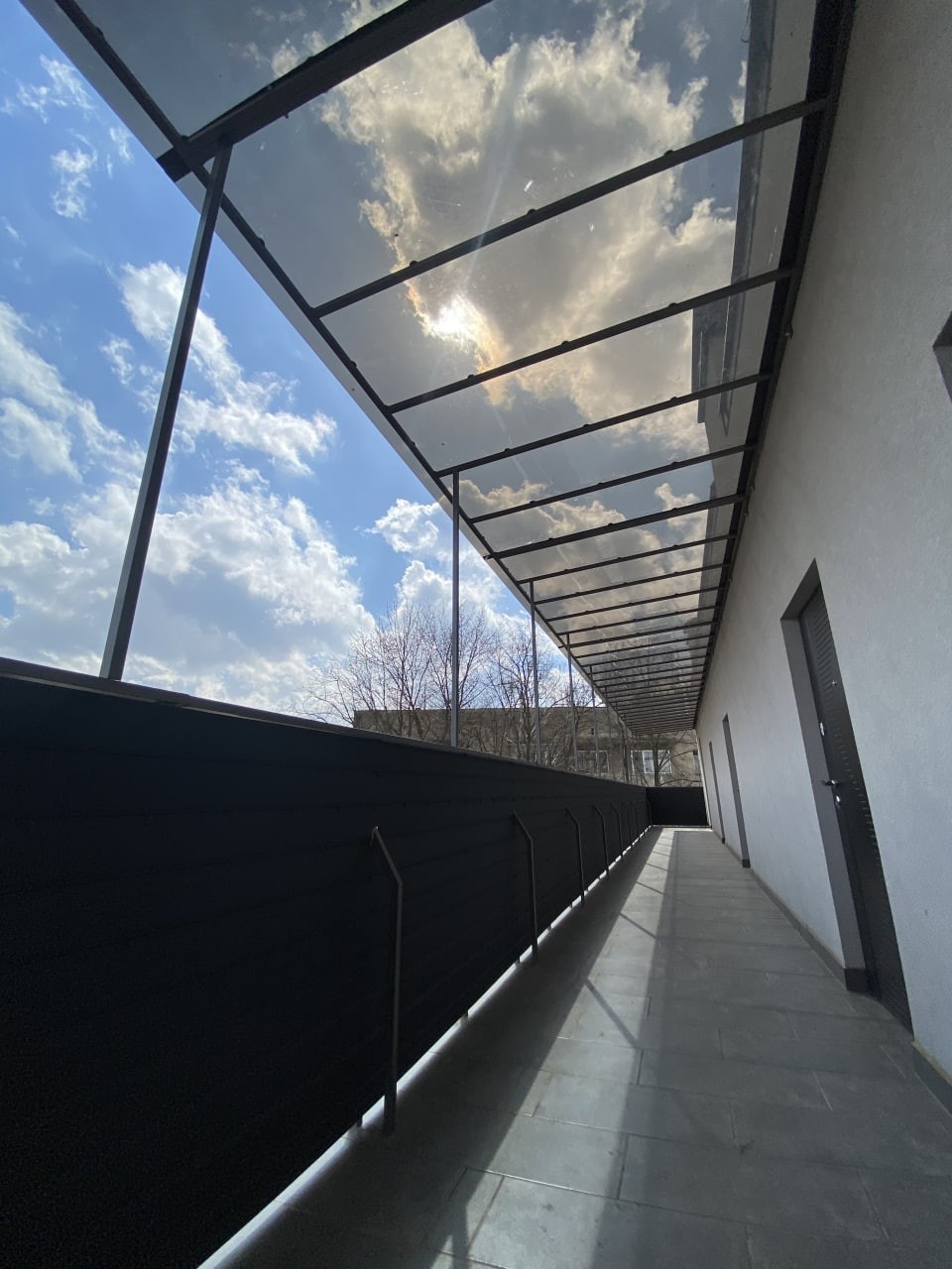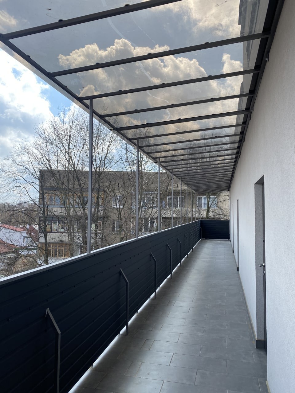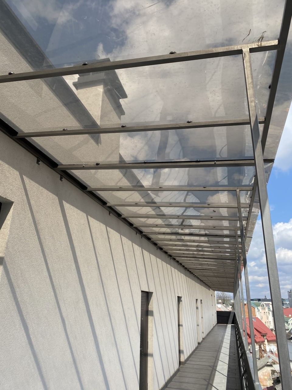Козирек або навіс виготовлений в основі рами з металу , пофарованої в темно сірий колір , на опорах до перил . Верх навіса зашитий монолітним полікарбонатом в темно сірому відтінку, який не бьється градом, має дуже хороші експлутаційні властивості і виглядає як скло. Ця вся конструкція виготовлена нашою компанією і професійно встановлена з врахуванням всіх ньюансів, наприклад полікарбонат має властивості розширюватись під час перепаду температур, і тому треба правильно його втсановити щоб потім не було проблем.