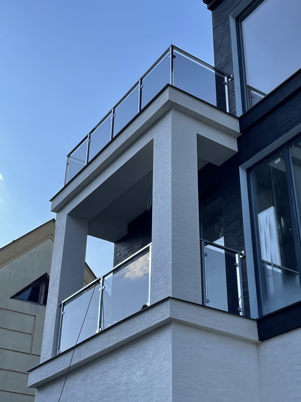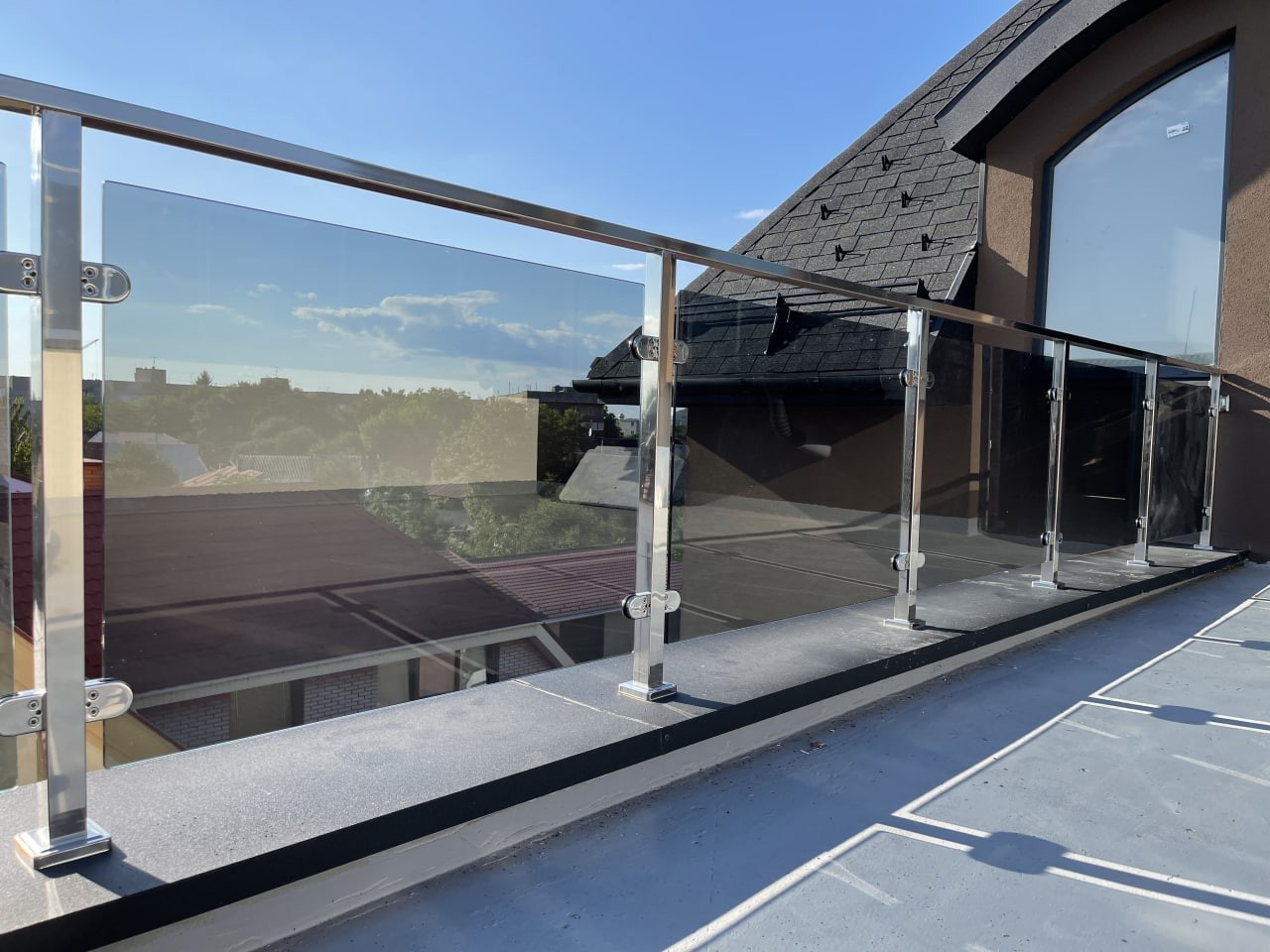 Перила з квадратних нержавіючих труб, в зеркальній поліровці, заповнені сірим тонованим склом. Виглядає дуже сучасно , на нових котеджних будинках . Практичне, гарне та сучасне рішення для огородження балконів.