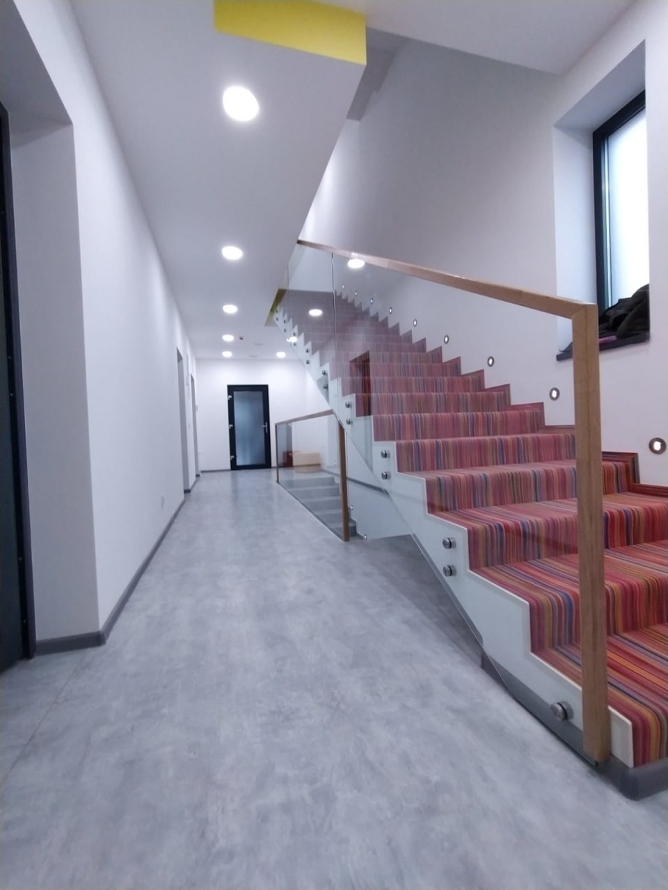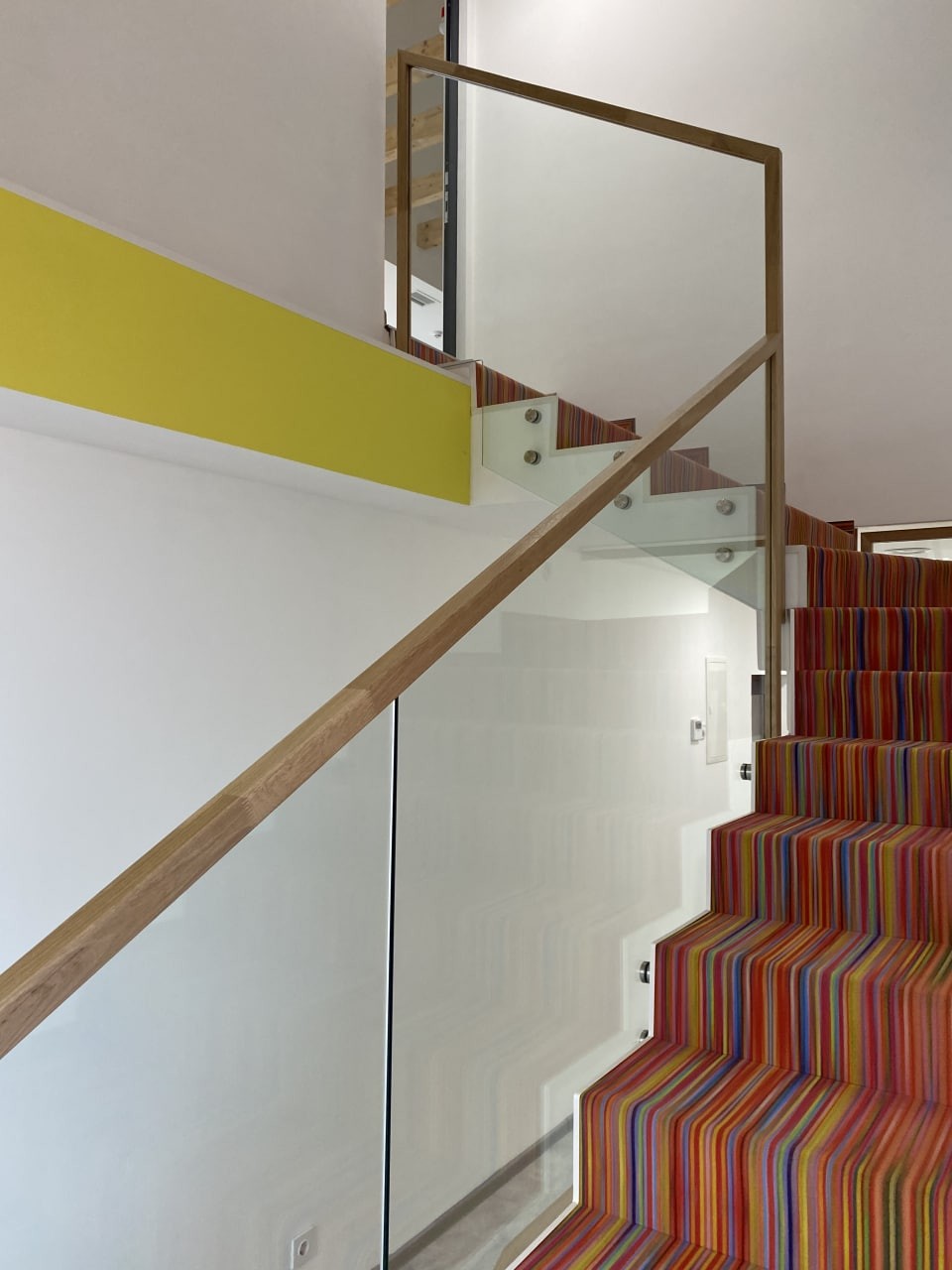 Перила виготовлені і встановлені з безпечного тріплексованого прозорого скла, закрите дубовим лакованим поручнем. Скло встановлене на бокове точкове кріплення і місцями в шину профіль на підлогу. Проект виконаний нашою компанією згідно проекту дизайнера.