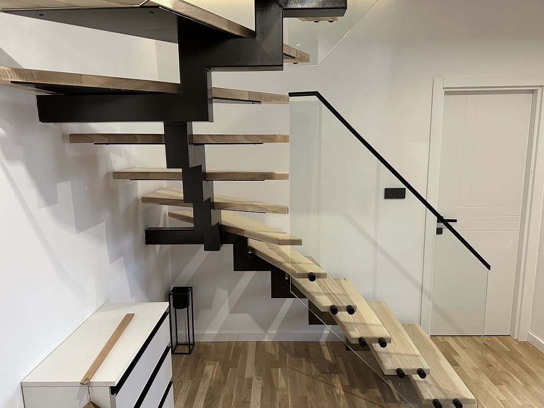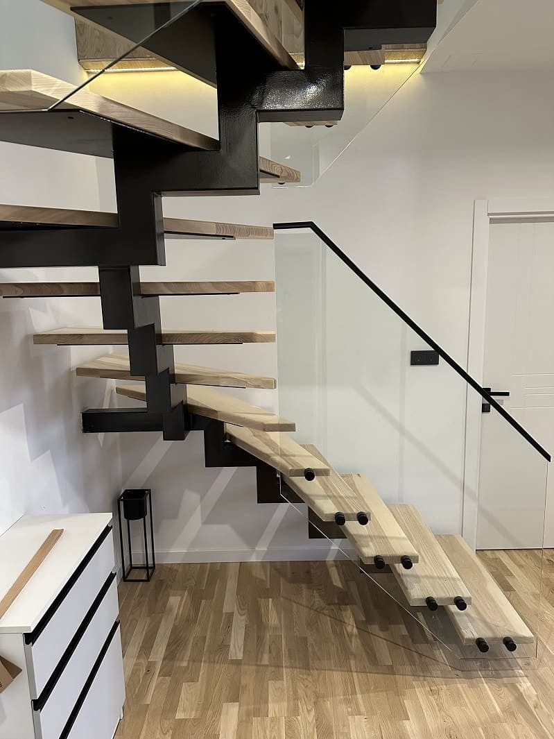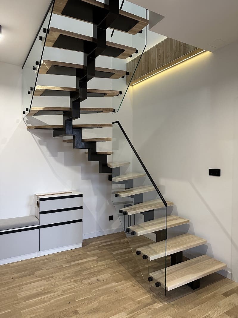 Спроектували, виготовили і встановили каркасні сходи. Каркас центральний із профіля 100*100 мм. Фарбований в чорний колір. Перила на сходи: прозоре скло, кріплення бокове на точки + поручень на скло. Фурнітура в порошковій фарбі, колір чорний мат.