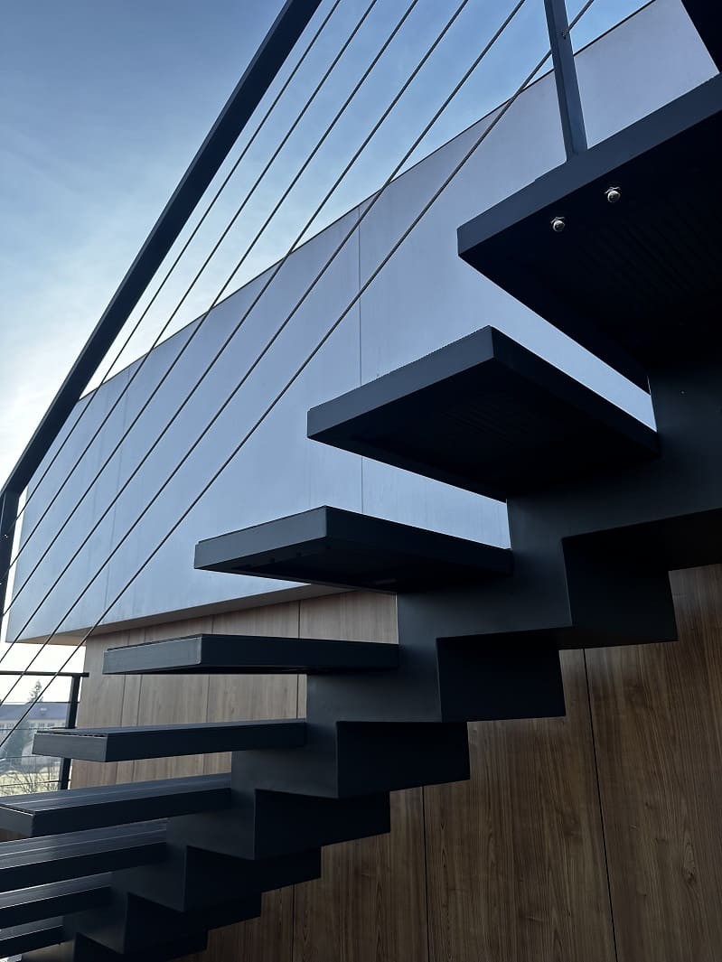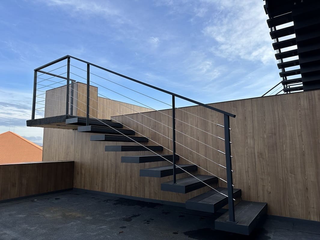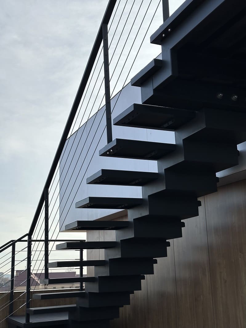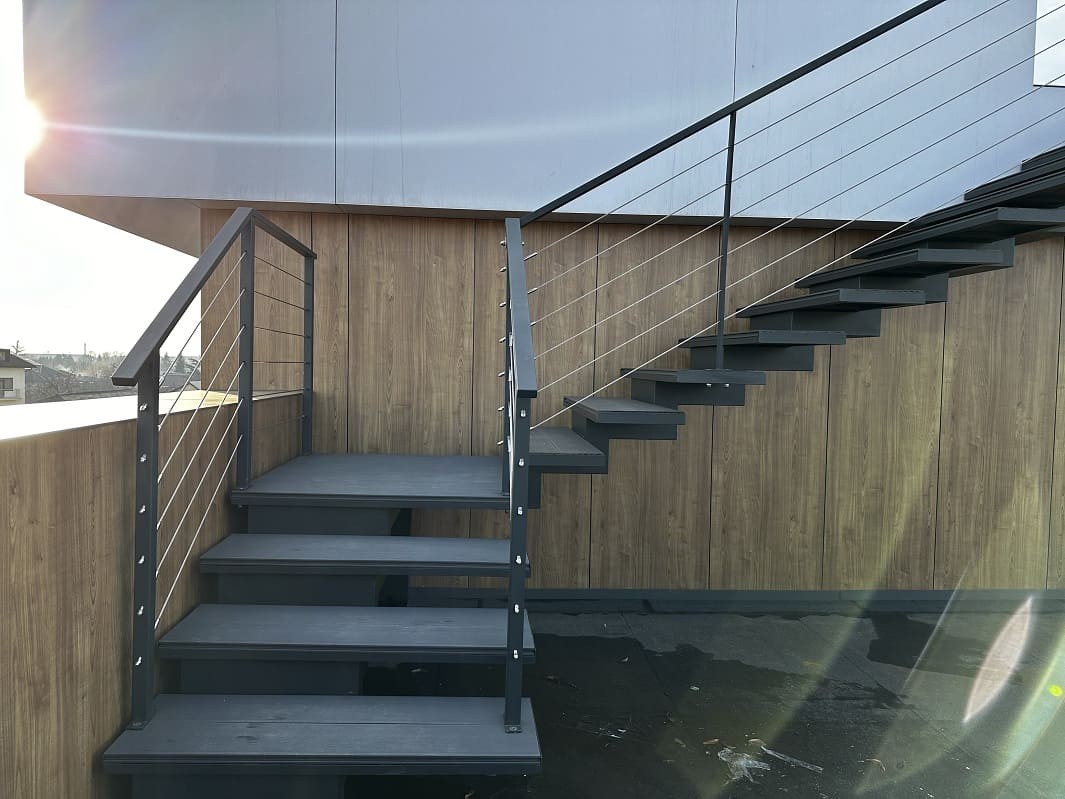 Нашою командою було спроектовано такий проект двух сходів. Виготовлено і змонтовано. Перші сходи називаються консольні сходи, безкаркасні. Сходинки із металу прикріплені до стіни без каркасу під ними, і все грамотно обшито. Тому кріплення не видно , і ступеньки як у повітрі. Другі сходи на монокаркасі, індивідуальний проект. Каркас виготовлений шириниою 500 мм, товщиною 100 мм. Все пофарбовано в порошкову фарбу. Самі сходинки зверху на обоїх сходах обшиті террасною дошкою. Яка супер виглядає і практична і не сковзька. Перила виконані з металу, в порошковій фарбі. Всі зєднання механічні. Заповнення перил - тросики із нержавіючої сталі.
