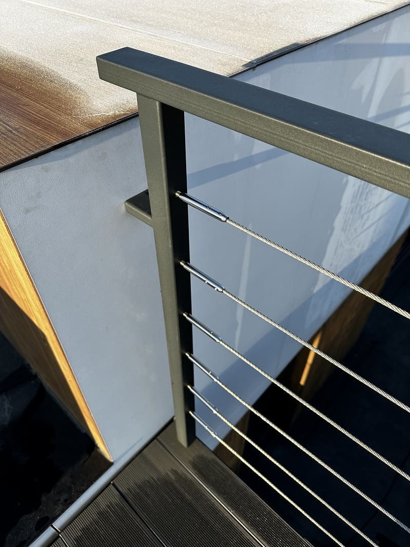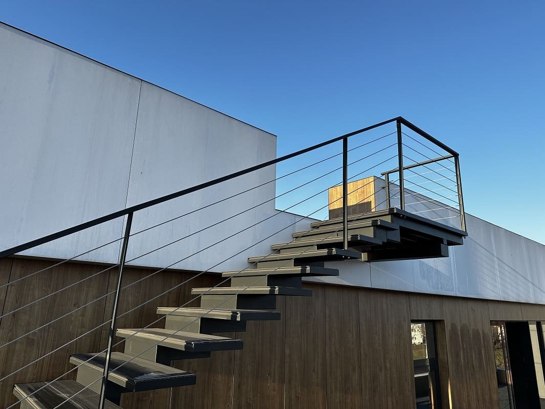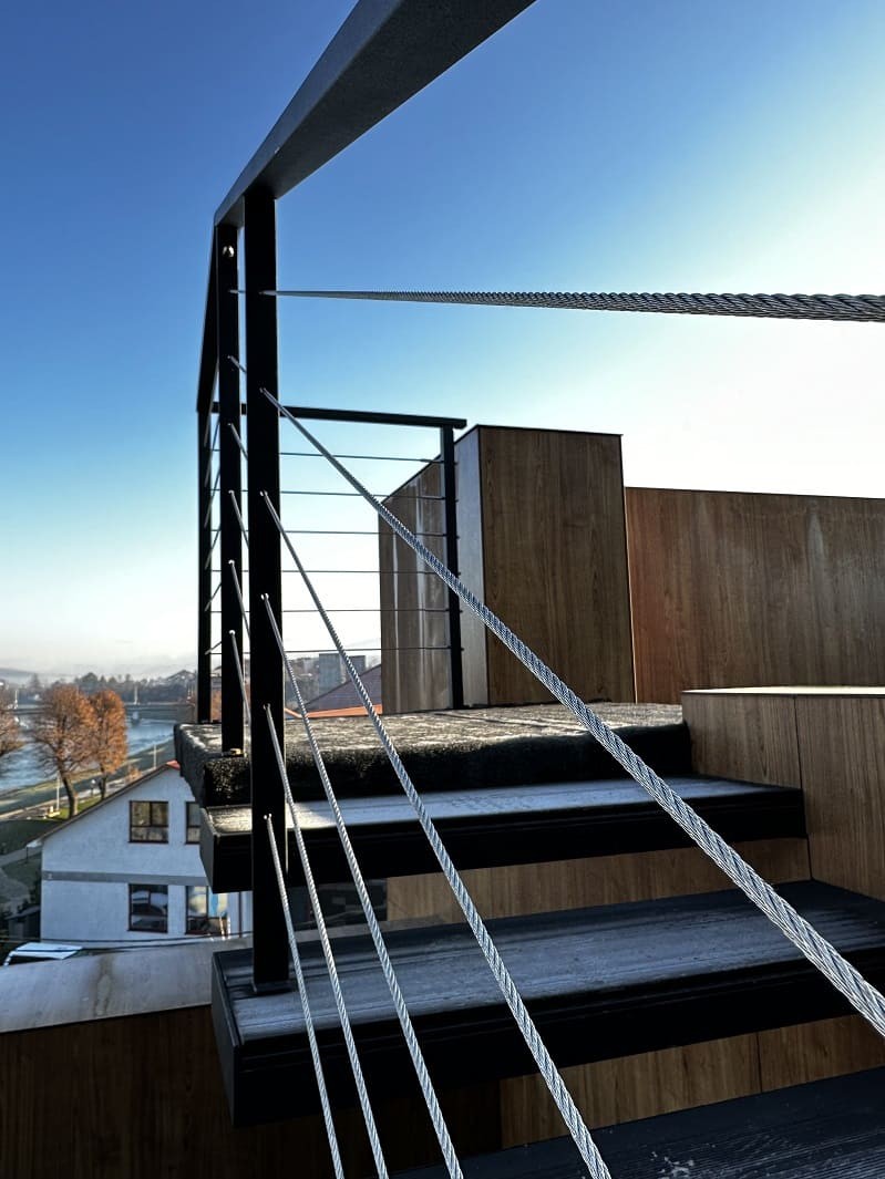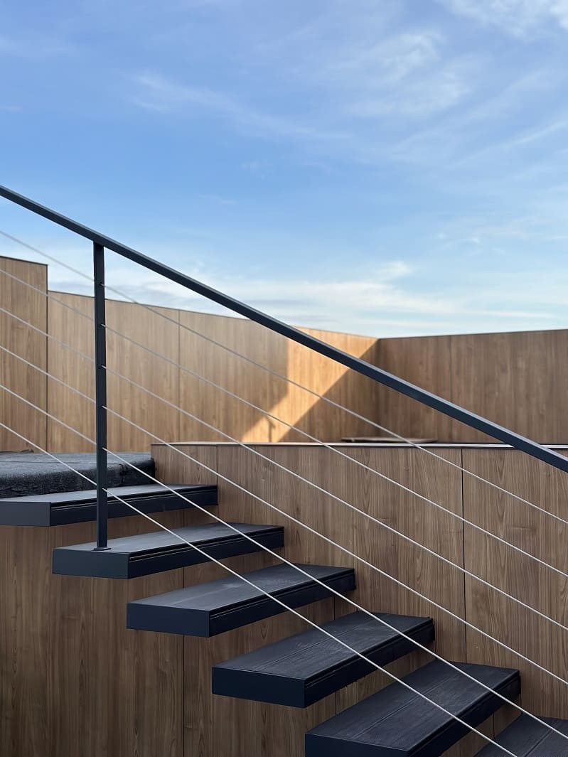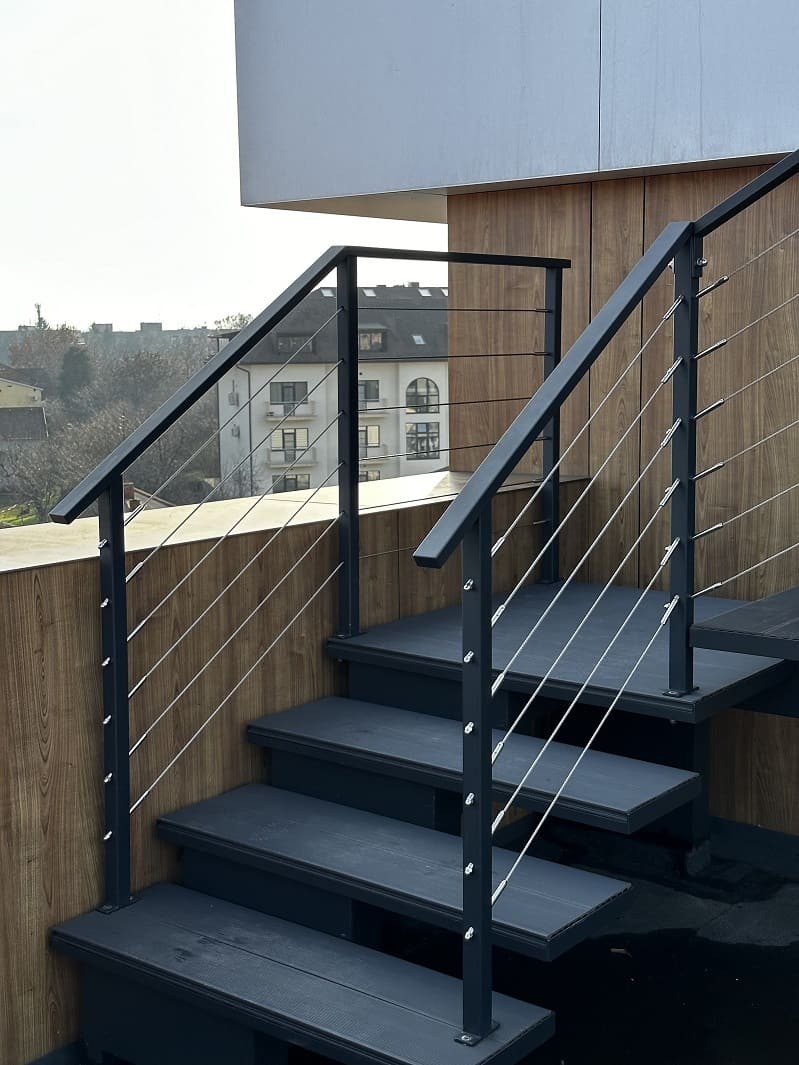 Нашою командою було спроектовано такий проект двух сходів. Виготовлено і змонтовано. Перші сходи називаються консольні сходи, безкаркасні. Сходинки із металу прикріплені до стіни без каркасу під ними, і все грамотно обшито. Тому кріплення не видно , і ступеньки як у повітрі. Другі сходи на монокаркасі, індивідуальний проект. Каркас виготовлений шириниою 500 мм, товщиною 100 мм. Все пофарбовано в порошкову фарбу. Самі сходинки зверху на обоїх сходах обшиті террасною дошкою. Яка супер виглядає і практична і не сковзька. Перила виконані з металу, в порошковій фарбі. Всі зєднання механічні. Заповнення перил - тросики із нержавіючої сталі.